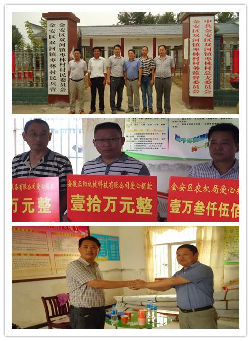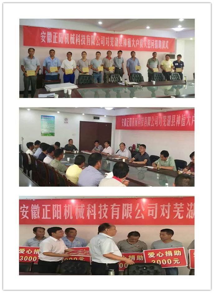 同時我公司針對今年長江中下游、江淮區(qū)域發(fā)生的嚴重的洪澇災害勇于擔當,注重快速發(fā)展自身的同時更高度重視企業(yè)社會責任,本著以回報社會為己任;企業(yè)利潤來之于民、用之于民;義利兼顧的宗旨,安徽正陽機械科技有限公司總經理張為法于2016年7月13日下午前往“正陽”糧食烘干機主銷區(qū)域安徽蕪湖、六安、湖北孝感等受災嚴重地區(qū)捐贈現金數十萬元,幫助災區(qū)人民萬眾一心共抗洪災,盡快恢復生產,讓受災群眾真實感受到黨和政府的溫暖、民營企業(yè)家的責任,公司以正能量品牌的形象和風范履行了自身應盡的社會責任。